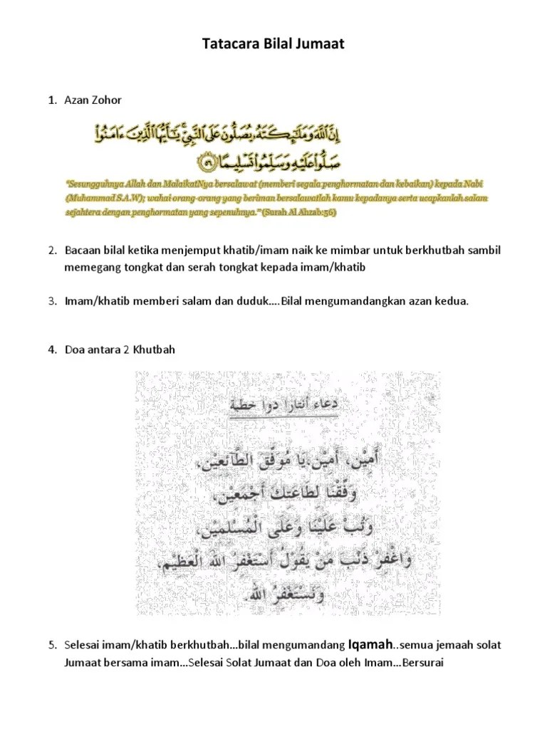 Ketika khatib shalat jumat duduk diantara dua khutbahnya sebagian orang ada yang berdoa sambil mengangkat kedua tangannya. Bab 12 tata cara shalat jum'at. Doa shalat tarawih dan bacaan bacaan bilal.